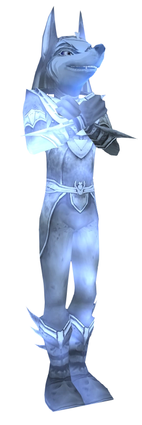 Anubis seems to be stubborn and distrustful, likely developed over time due to Set's betrayal. Despite being the god of death, he seems to be serious about protecting the living. While in his tower, he appeared as a giant statue that was incapable of moving, but had yellow, glowing eyes. He was later freed from this, and transformed into a demi-god form to help Sphinx fight.