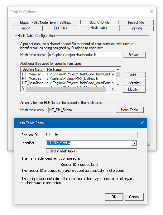 HT_Filesection. If we openGrafix/Animations/Main Player/MC_Sphinx.elfin EuroLand and click on Project to open Project Options > Hash Table we can see that it usesHT_File_Sphinx. - Once we export that file via App Targets > PC > right-click menu > Output (Optimised) the .EDB will retain the tag. An entry in Filelist.bin will map it to its exported .EDB counterpart. So when the game finds the hashcode in