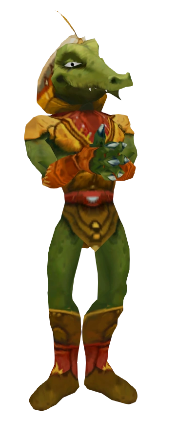 The Gauntlet Man is an anthropomorphic crocodile with green, scaly skin.
