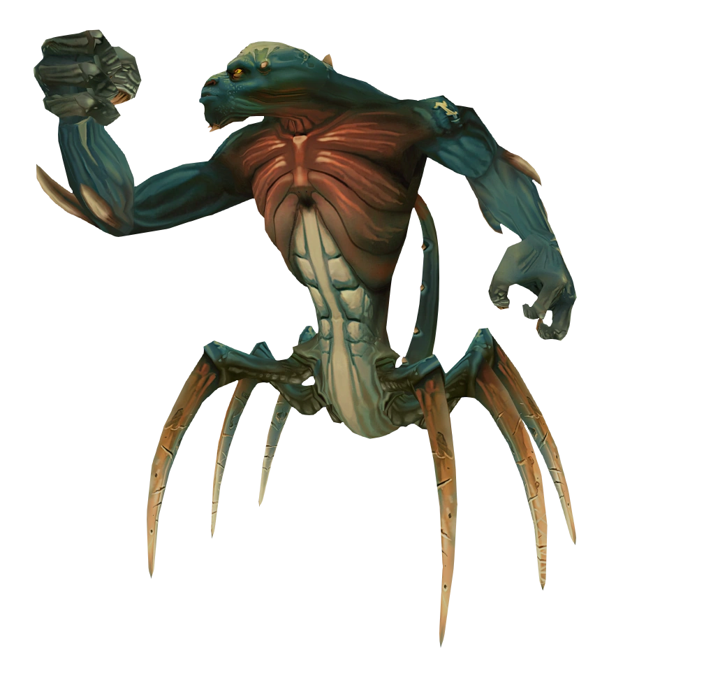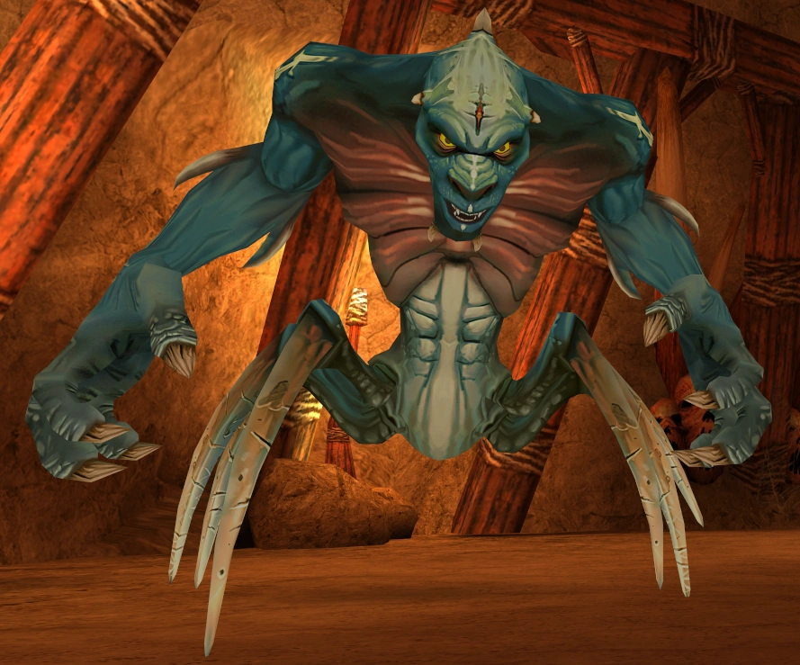 The Pharaoh Spider was teal-tinted and had six legs, a humanoid torso, and a scorpion stinger on the tip of his tail. His arms are extremely long and can reach Sphinx from far away.