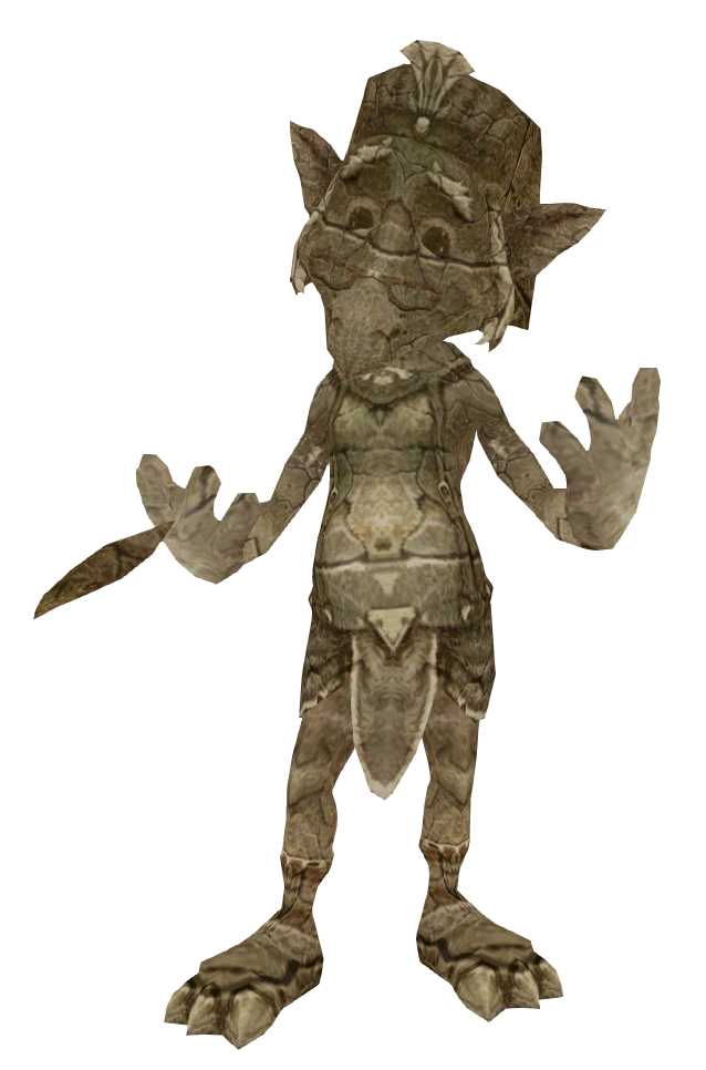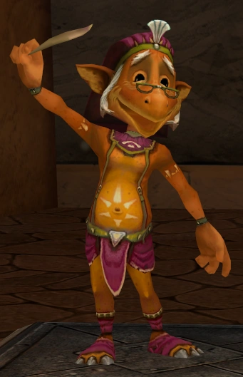 The Scribe has yellow skin and white facial hair, suggesting that he is old.