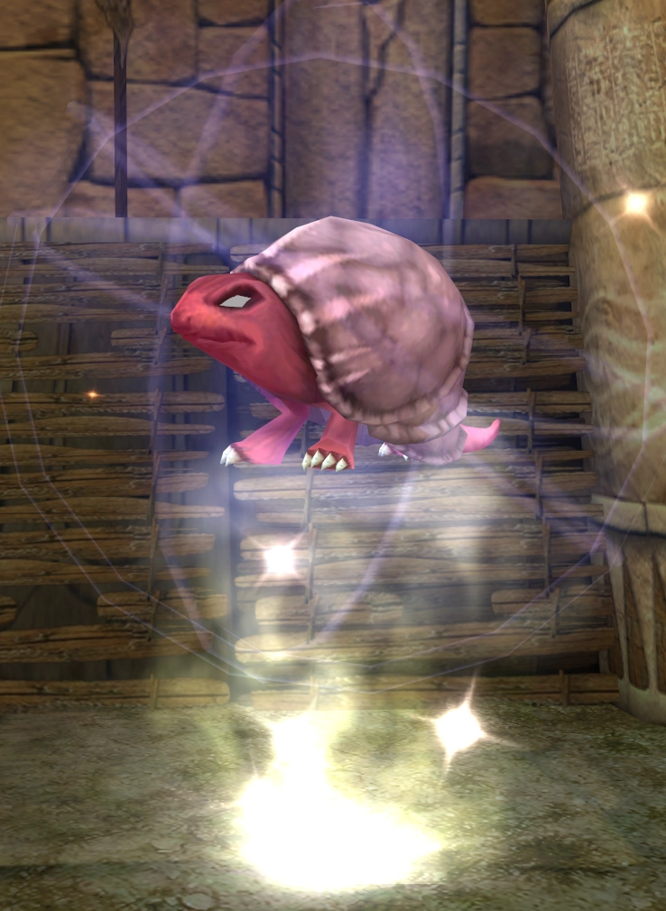 The Shell Critter is a shy, turtle-like monster with pink flesh and a grey shell.