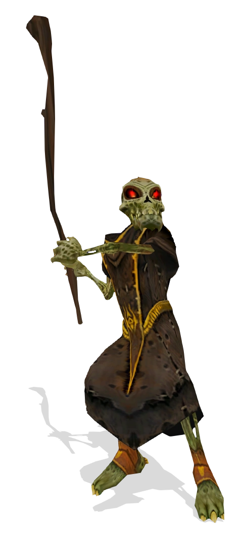 Similar to the appearance of the Skull Swordsman, the Skull Worshipper wears a brown tunic over its corpse-like body. It wields a flaming staff.
